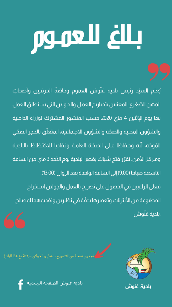 المستجدات بلاغ خاص بتصاريح العمل و الجولان By admin Last updated مايو 2, 2020 0 0 Share 0 0 Share FacebookTwitterGoogle+ReddItWhatsAppPinterestالبريد الإلكتروني