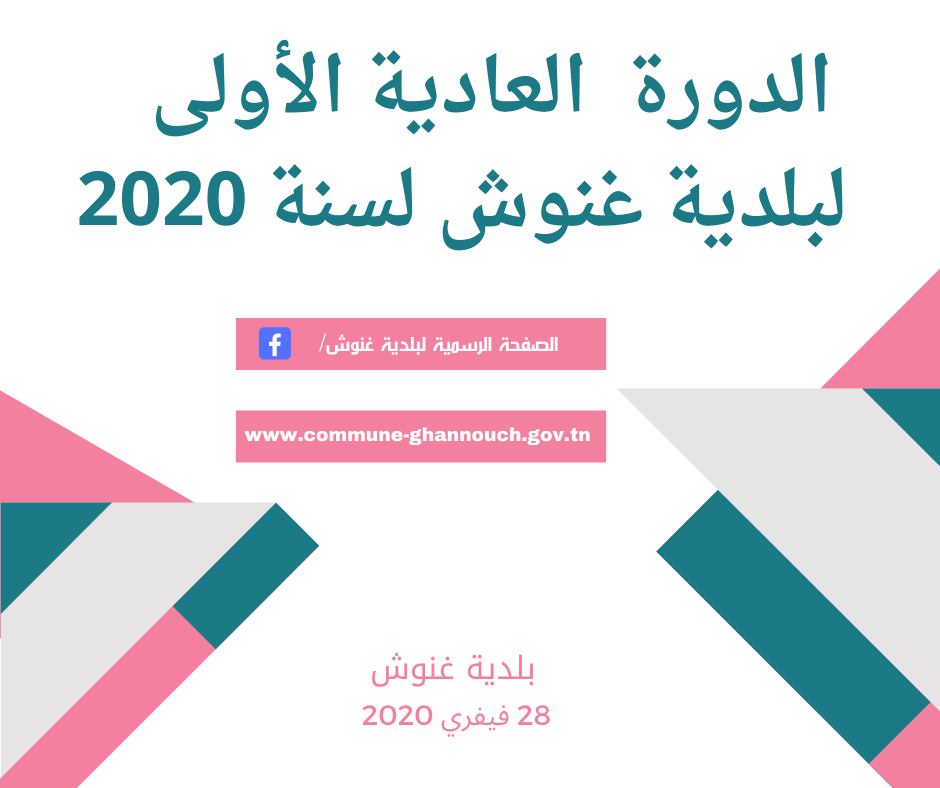 أتشرف باستدعائكم لحضور جلسة الدورة العادية الأولى للمجلس البلدي بغنوش لسنة 2020 التي ستنعقد يوم الجمعة 28 فيفري 2020 على الساعة الثالثة والنصف مساء بمقر البلدية .