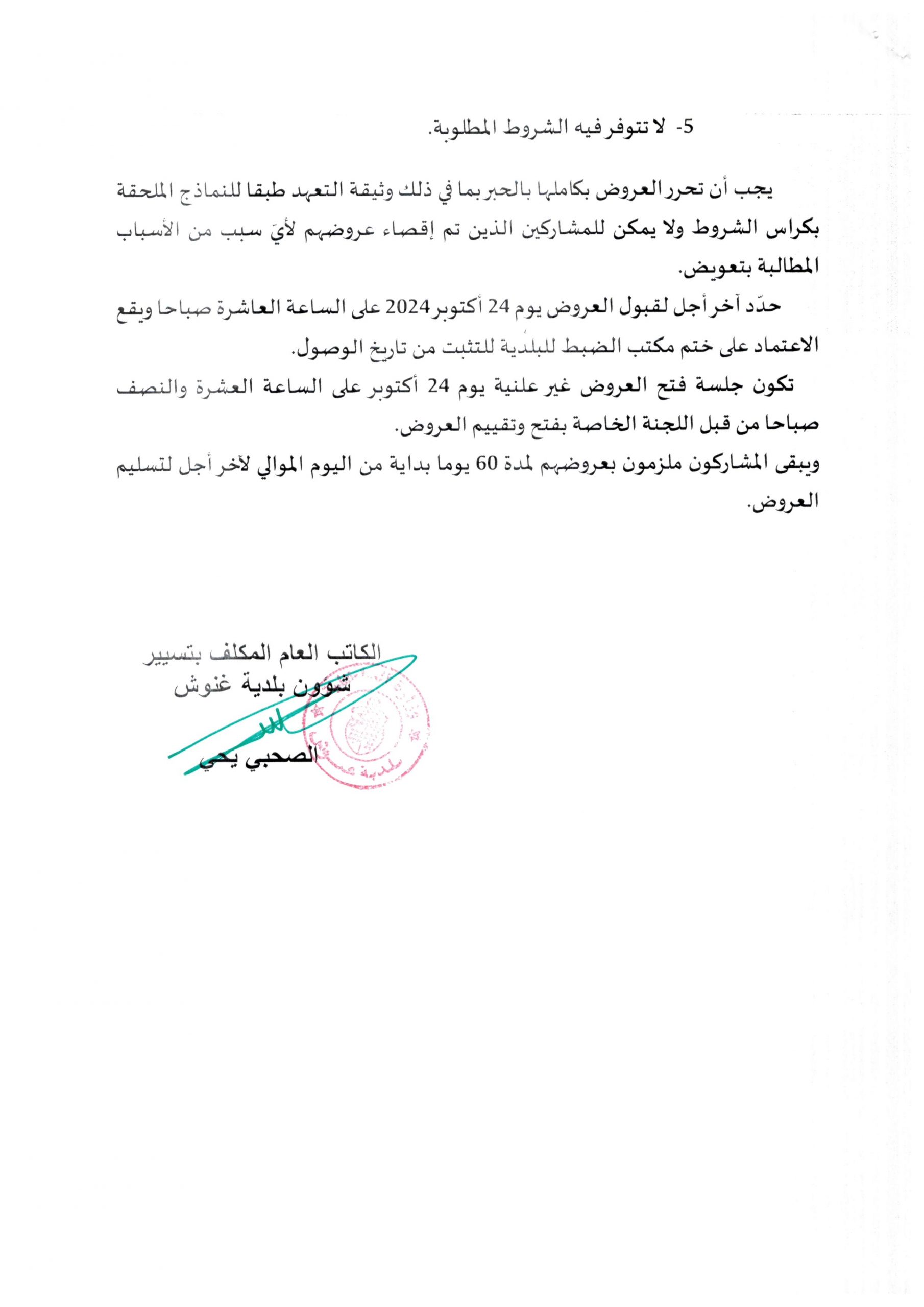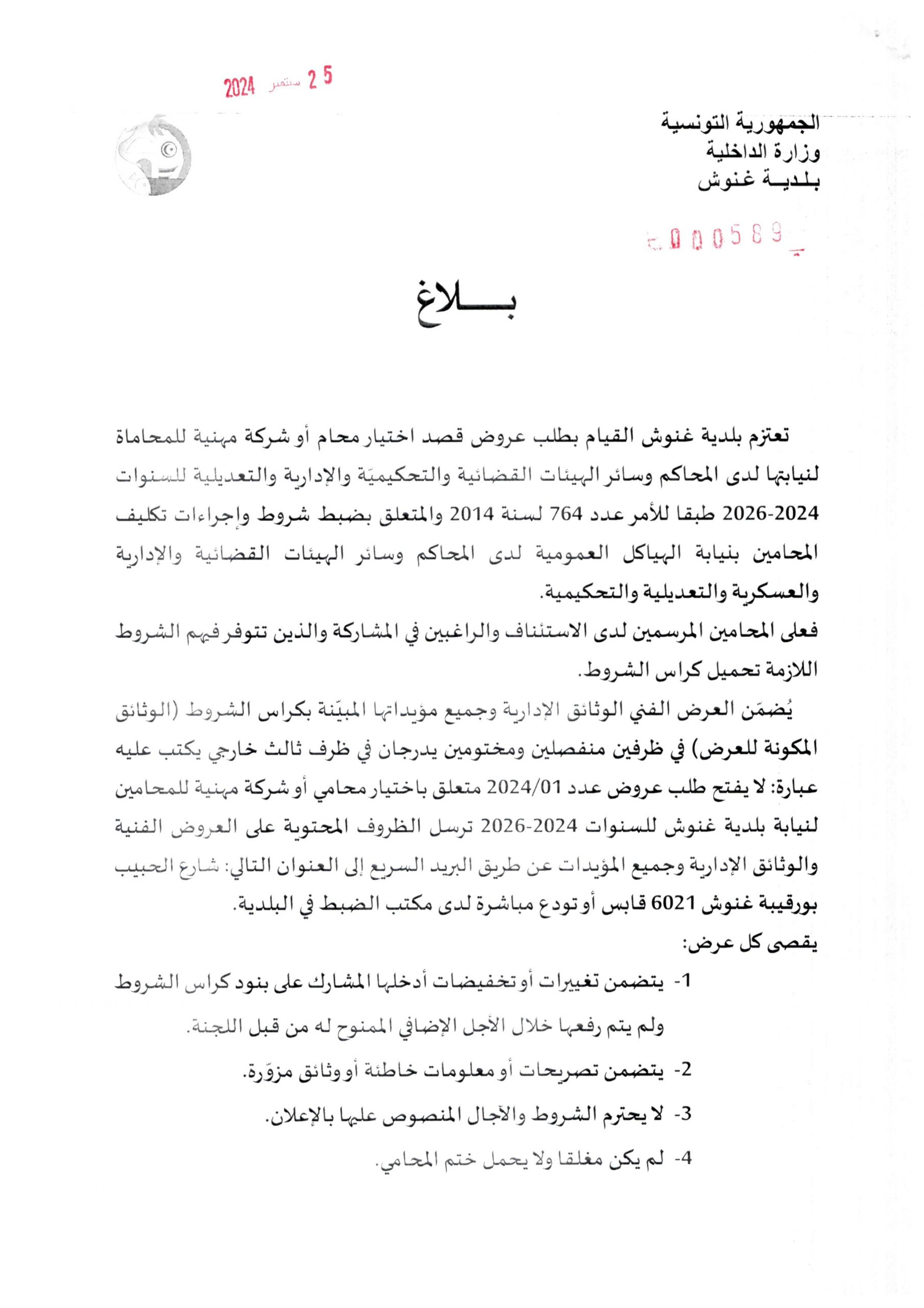 طلب عروض قصد اختيار محام أو شركة مهنية للمحاماة للنيابة لدى المحاكم وسائر الهيئات القضائية والتحكيمية والإدارية والتعديلية للسنوات 2024-2026